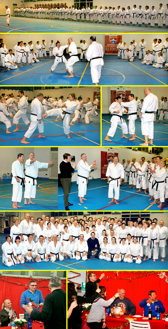 La palestra del Collegio Villoresi di Merate ha accolto, per il secondo anno consecutivo, un importante evento di karate: lo stage del Maestro Hiroshi Shirai c.n. 10° Dan, fondatore dell'Istituto Shotokan Italia (ISI), ente morale per lo studio dello stile omonimo e riconosciuto dal Consiglio dei Ministri. Conosciuto in tutto il mondo e seguitissimo nei suoi stage, e difficile trovare date in cui e disponibile ma, grazie alla profonda stima e amicizia che lo lega al Maestro Colombo della scuola di Karate Shotokan Ryu, siamo riusciti ad averlo nuovamente a Merate. L’evento che vede come partner Villoresi Merate Sport Academy e A.S. Montevecchia, ha coinvolto oltre 100 atleti che , nonostante il lungo week end di festa, con entusiasmo, si sono impegnati per due ore in una lezione esemplare in cui sono stati analizzati e spiegati aspetti tecnici di alcune tecniche fondamentali quali: la postura, la dinamica, la transazione, la respirazione e l’atteggiamento mentale. Il Maestro Shirai, dopo moltissimi anni di pratica, esperienza, studio e ricerca, partendo dall’applicazione dei kata (sequenza fissa di tecniche) ha creato con il Goshindo una nuova forma di approccio alla difesa personale. Lo stile Shotokan e puro e codificato: il Maestro Shirai con il Goshindo ha reso “piu reale” il combattimento. Primo scopo di uno stage e apprendere e il Maestro Shirai, grazie alla sua personalita e profonda conoscenza della disciplina, crea nelle sue lezioni quella particolare e magica atmosfera di entusiasmo e voglia di apprendere; tant’e che lo stage era fissato per le ore 18:00 ma gia un’ora prima gli atleti erano in palestra per fare riscaldamento e farsi trovare pronti alla lezione. Come dicevamo, lo scopo principale di un allenamento resta quello di produrre risultati consistenti ed e proprio per questo che gli atleti presenti in palestra non hanno voluto perdere nemmeno uno degli insegnamenti impartiti dal Maestro: il livello di concentrazione e stato altissimo per tutta la durata dello stage. Le tecniche spiegate sono state dapprima dimostrate, poi fatte provare e riprovare, spiegando, dove venivano eseguite non maniera corretta, cosa era necessario correggere al fine di renderle efficaci. Alla manifestazione e intervenuto anche l’Assessore Giuseppe Procopio, che ha portato al Maestro Shirai ed al Maestro Colombo i saluti e gli auguri, suoi e dell’Amministrazione Comunale di Merate, ringraziandoli del lavoro svolto nel territorio. “Per fare un buon karate servono tecnica, corpo e spirito”le parole del Maestro a chiusura dello stage; noi ne facciamo tesoro e lo ringraziamo per aver trasmesso forti emozioni e aver allietato, con la sua presenza, la cena tenutasi a fine stage, alla quale hanno partecipato anche due rappresentanti dell'Amministrazione Comunale di Concorezzo: l'Asessore con delega allo sport Marco Mariani e Della Bocca Laura che hanno portato i saluti del Sindaco e di tutta l'Amministrazione di Concorezzo, dove la scuola Shotokan Ryu tiene dei corsi di karate. Oss. |